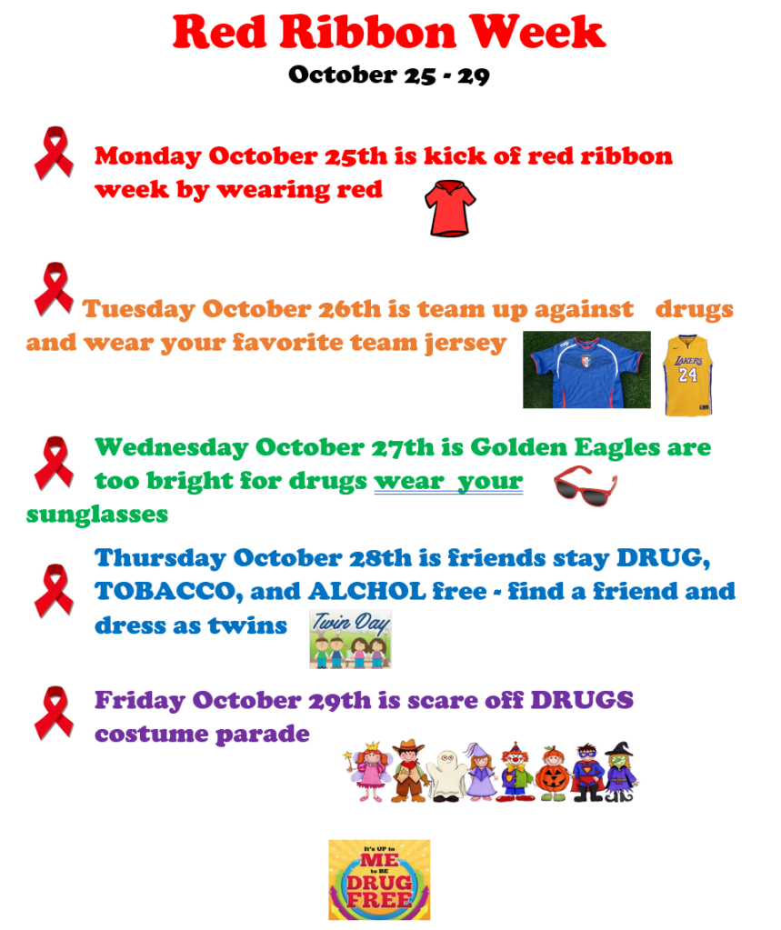 Our Red Ribbon week will wrap up on Friday, Oct 29 at 8:30 am with a Costume Parade. Please be sure to read all the safety guidelines that must be followed. There will be no exceptions.