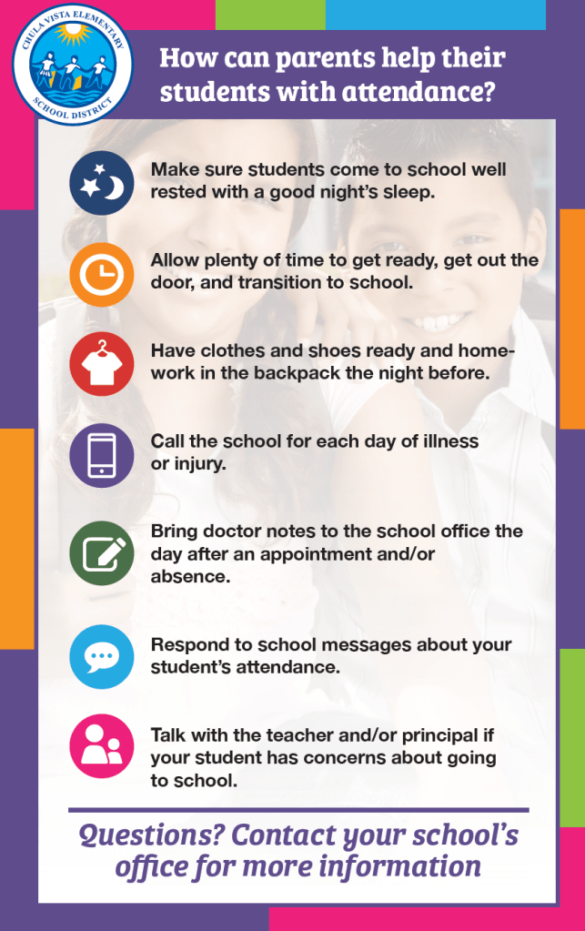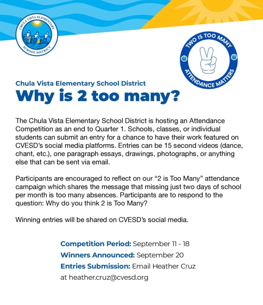 Students need to be at school every day and on time. Please make sure your child is here by 8:15 a.m. and lined up on the blacktop. Let’s continue to improve our attendance! If your child must be out sick, please contact the office at 619-656-2030 to excuse the absence. Remember to bring a doctors note when going to the Dr. or dentist.