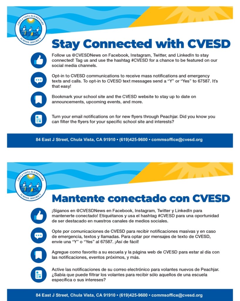 You Can CLICK HERE for all of the upcoming information about CVESD University. This is an excellent way to become involved in your child’s education as well as learning more about the district.